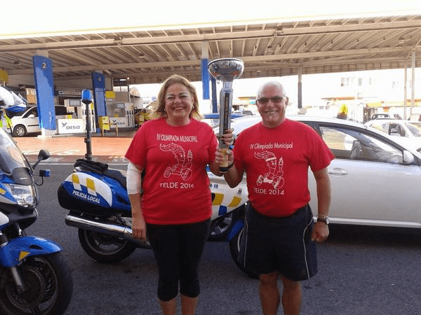 Telde.-  La alcaldesa de Telde, Mari Carmen Castellano, se puso este viernes la ropa de deporte y portó la antorcha olímpica que desde hace varios días recorre el municipio. Lo hizo por la calle principal del barrio de El Calero, acompañada por el maestro Domingo Ramos Velázquez, recientemente jubilado a quien rindieron posteriormente un homenaje.
