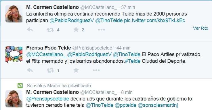 La primera regidora quiso destacar esta acción en su cuenta de Twitter (‏@MCCastellano), asegurando que la antorcha olímpica continuaba recorriendo Telde y que iban a participar en este hecho más de 2.000 personas. Sin embargo se encontró con la respuesta de @Prensapsoetelde que aseguró: “El Paco Artiles privatizado, el Rita mermado y los barrios abandonados. #Telde Ciudad del Deporte”.