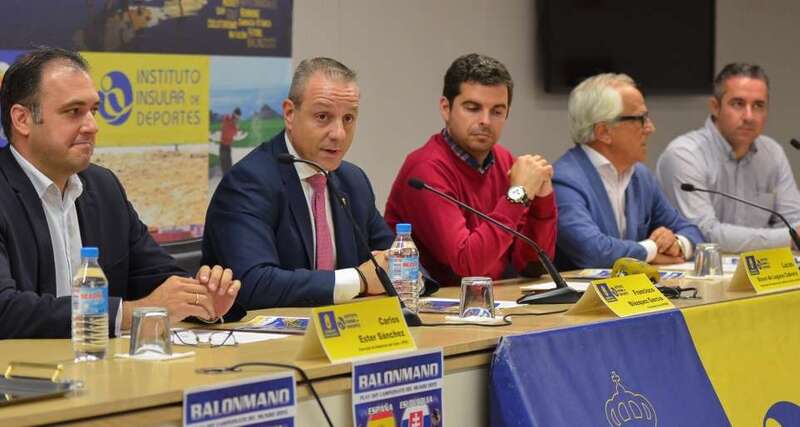 Telde.- El consejero de Deportes del Cabildo de Gran Canaria, Lucas Bravo de Laguna, el presidente de la Real Federación Española de Balonmano, Francisco Blázquez y los concejales de Deportes y de Turismo del Ayuntamiento de Las Palmas de Gran Canaria, Carlos Ester y Pablo Barbero, presentaron este miércoles el encuentro internacional que enfrentará a España y a Eslovaquia en el Centro Insular de Deportes (CID) el próximo 7 de junio.