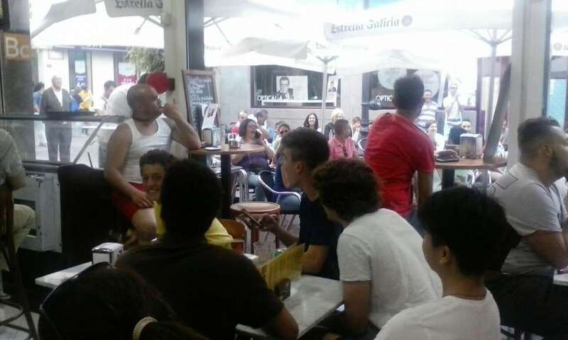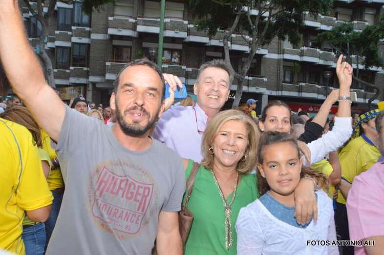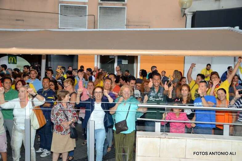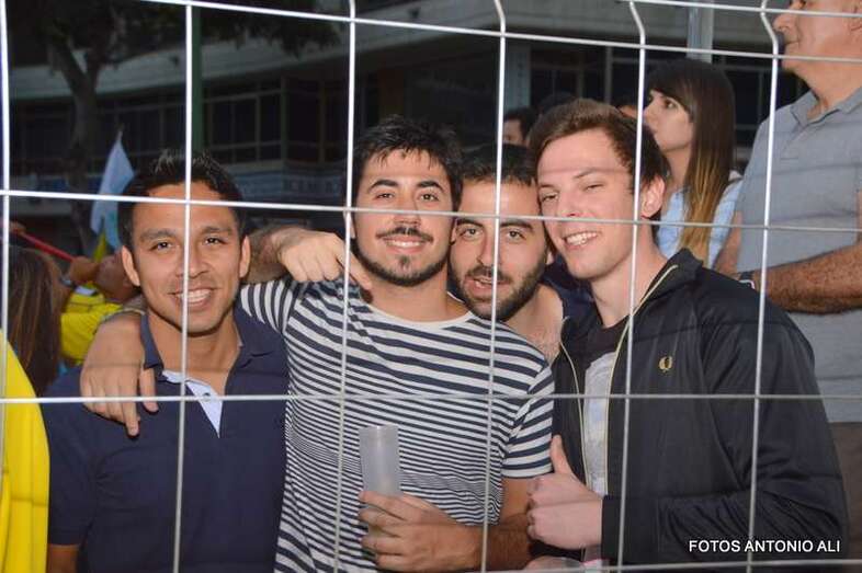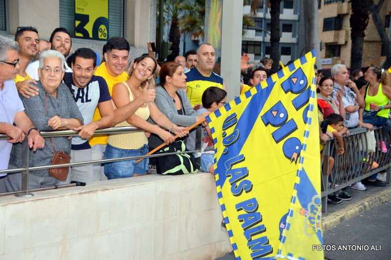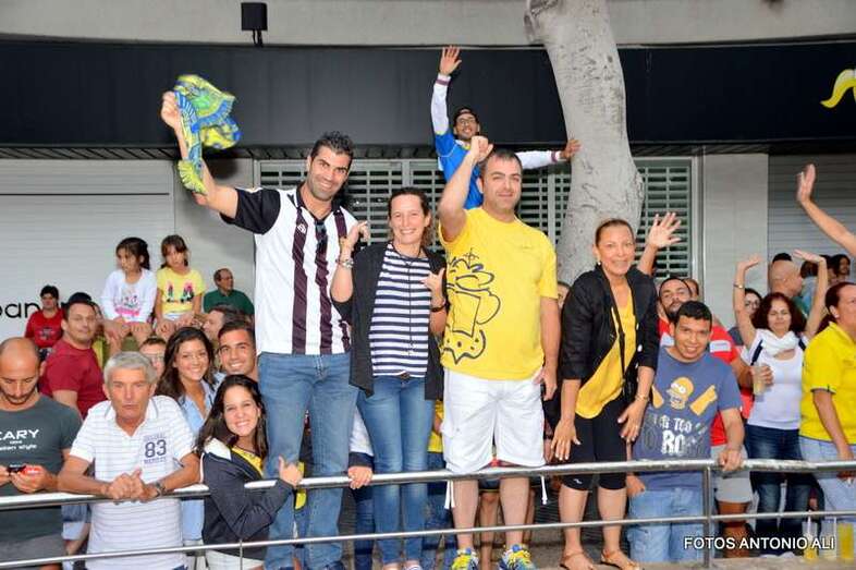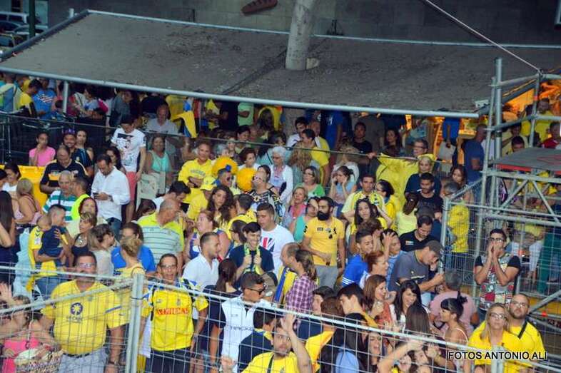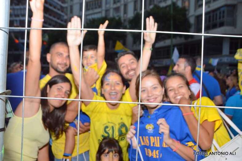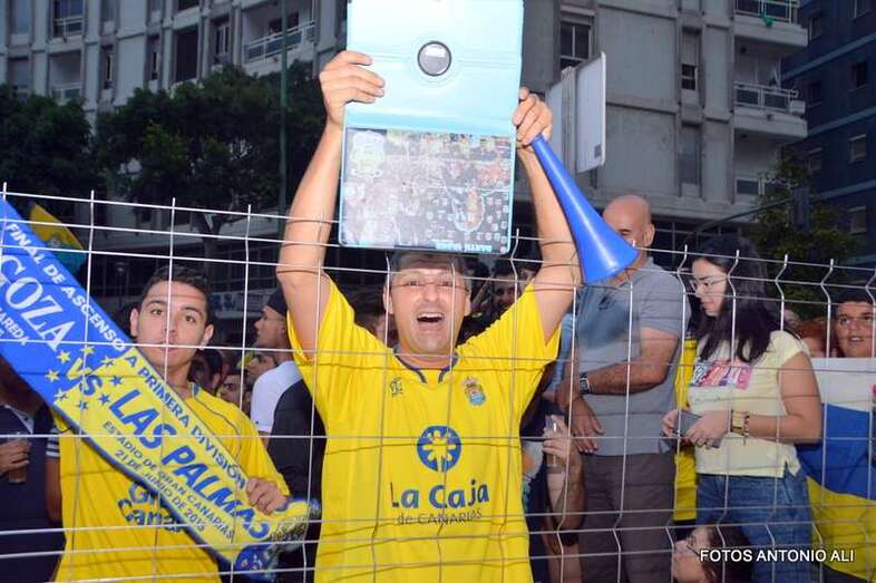 Cientos de aficionados teldenses de la UD Las Palmas celebran desde esta tarde el ascenso del equipo amarillo a Primera División, consumado en el Estadio de Gran Canaria tras vencer por 2-0 ante el Real Zaragoza en el partido de vuelta del 'play-off' final (3-1 en el de ida).