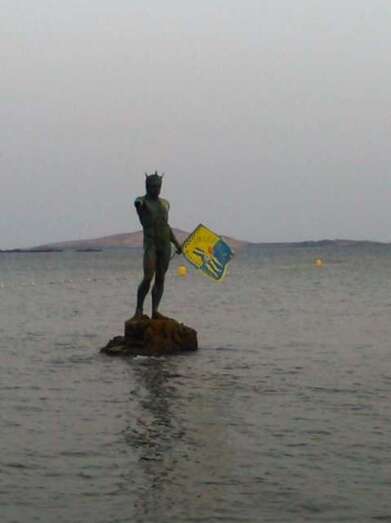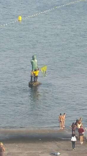 El triunfo del equipo grancanario ha desbordado la alegría en la ciudad. Hasta la escultura del Neptuno, en el Puntón de Melenara, ha querido sumarse al triunfo enarbolando la bandera del cuadro amarillo.