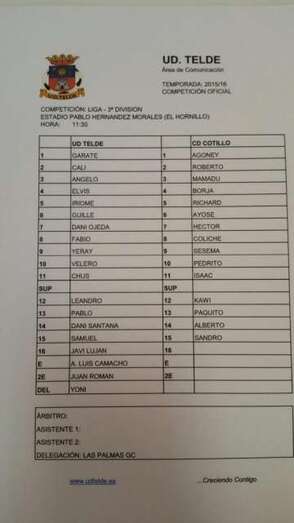 UD Telde: Garate; Cali, Ángelo, Elvis, Iriome, Guille, Dani Ojeda, Fabio, Yeray, Velero y Chus Quintana