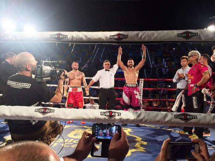 El boxeador grancanario, el teldense Ferino V no dio opciones a su rival, el italiano Davide Doria, en el combate estelar de la Noche de Campeones. En el primer asalto, ninguno de los dos boxeadores asumió riesgos, analizando a su oponente y sin imponerse uno sobre el otro. Ya en el segundo round, Ferino V comenzó a conectar golpes contundentes sobre el italiano, quien se iba refugiando en las esquinas del cuadrilátero.