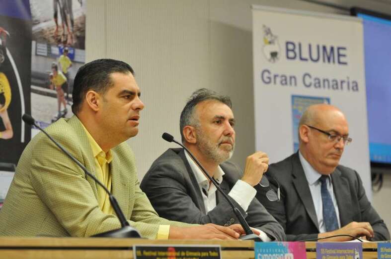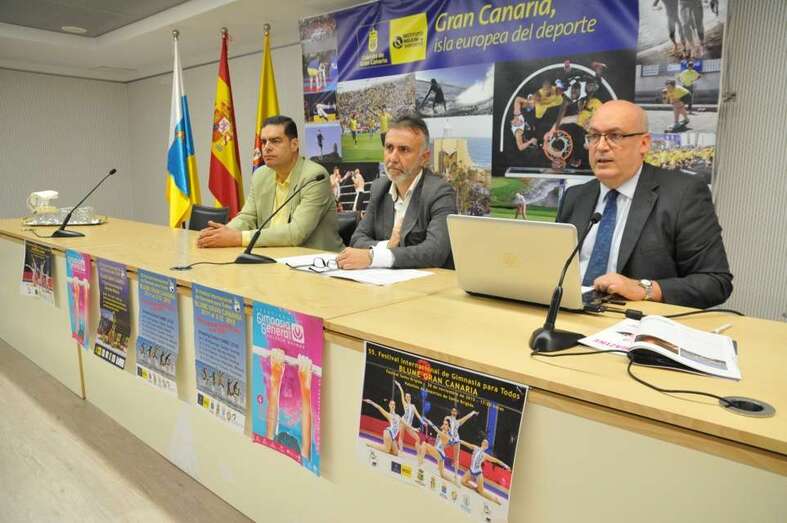 Telde.- El consejero de Deportes del Cabildo de Gran Canaria, Ángel Víctor Torres, el concejal de Deportes del Ayuntamiento de Telde, Diego Ojeda y el organizador del evento, Jesús Telo, presentaron en el Gran Canaria Arena una nueva edición, la 55, del Festival Internacional de Gimnasia Blume Gran Canaria 2015.