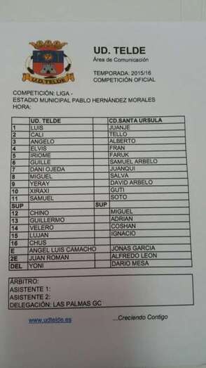 UD Telde: Luis,Airam, Ángelo, Elvis, Iriome, Guille, Ojeda, Miguel Ángel (Luján, min. 85),Yeray, Xiraxi (Velero, min. 70) y Samuel (Chus, min. 68).