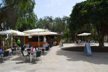 La cafetería se encuentra ubicada en las inmediaciones de la zona de juegos infantiles, aprovechando la estructura prefabricada que en su día instaló la empresa Aguas de Telde con la misma intención pero que nunca llegó a prosperar.