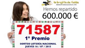 Telde.- A Telde le sigue sonriendo la suerte. La Administración número 8, La Brujita de Telde, en el Centro Comercial Alcampo, repartió dos series del número 71.587, premiado este jueves con el primer premio del Sorteo de la Lotería. En total, el premio asciende a 600.000 euros (300.000 euros la serie y 30.000 euros al décimo).