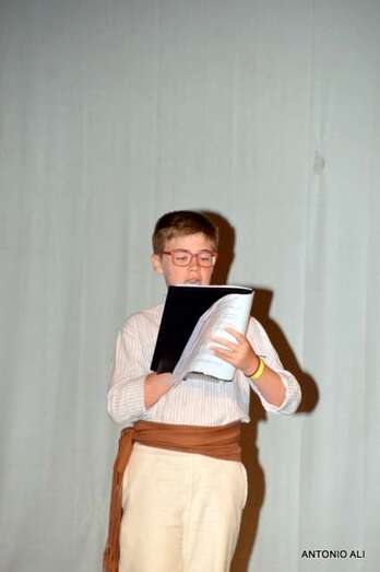 Un grupo de alumnos y alumnas interpretan cortos fragmentos recitados en representación teatral de la obra de D. Miguel de Cervantes “El Quijote”.