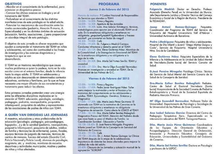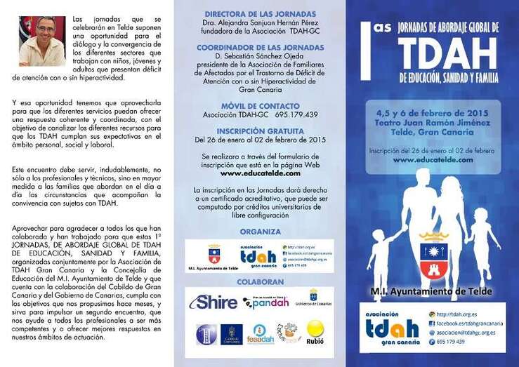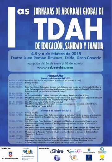 Telde.- La Concejalía de Educación del Ayuntamiento de Telde y la Asociación de Familiares de Afectados con Trastornos por Déficit de Atención con o sin Hiperactividad de Gran Canaria, organizan las 1ª jornadas de abordaje global de TDAH de educación, sanidad y familia. El evento tendrá lugar los días 5 y 6 de febrero en el Teatro Juan Ramón Jiménez, con la participación de diez ponentes.
