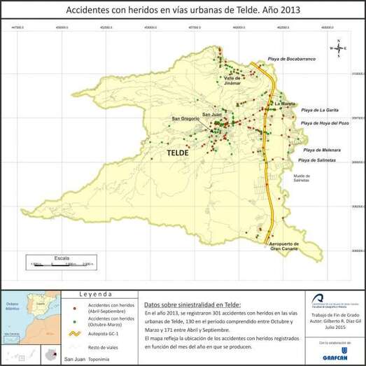 El estudio verificó que en 2013 se registraron en Telde 301 accidentes con heridos en sus vías urbanas, de los que 171 tuvieron lugar entre abril y septiembre y el resto entre octubre y marzo, según se pone de manifiesto en el mapa elaborado por Díaz que forma parte de su trabajo de investigación.