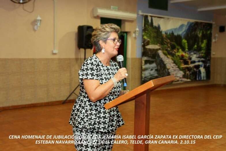 Una amplia representación de la comunidad educativa del CEIP Esteban Navarro Sánchez de El Calero de Telde, familiares, amigos, la noche del viernes 2 de octubre, dedicaron un emotivo homenaje a la que fuera su directora hasta el pasado 31 de agosto, María Isabel García Zapata, en la cena que con motivo de esta celebración con la presencia de la alcaldesa de Telde Da. Carmen Hernández Jorge, 2º Teniente Alcalde de Telde, D. Alejandro Ramos, Inspector de Educación de la Zona Telde-Costa, 319 de Canarias, D. Francisco Castellano González, Concejalas del Ayuntamiento de Telde, Sra. Presidenta del Círculo Cultural de Telde, Da. Lucana Falcón León, actual Directora del centro docente, Da. Carmen Terrón Álvarez, Secretaria Da. María del Carmen Robaina Fleitas.