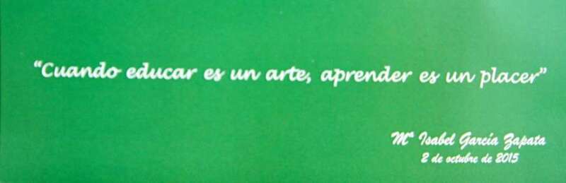 En cada una de las mesas donde se celebra la cena de jubilación hay una tarjeta con diseño del escultor y dibujante Máximo Riol y saludo de Maribel García en la que destaca el lema: Cuando educar es un arte, aprender es un placer.  Y así ha sido, aprender, conocer y reconocer el esfuerzo de los que dedican sus vidas a uno de los ejercicios más bonitos, esenciales para el desarrollo y progreso de la humanidad, el de docente y de los que hemos tenido la suerte de iniciarnos en el camino de la formación de sus lecciones como transmisores del mejor legado que la humanidad nos debemos, la cultura y la educación. Tratemos que todos tengan acceso a esta educación, el futuro nos va en ello, y de manos de profesionales que aman, sienten y han ejercido esta vocación como lo ha demostrado María Isabel García Zapata en su quehacer diario de docente.