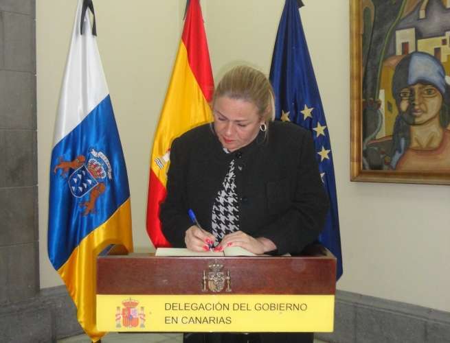 La alcaldesa de Telde, Mari Carmen Castellano, acudió esta tarde a la Delegación del Gobierno en Canarias a firmar en el libro de condolencias habilitado por esta institución y transmitió en nombre de toda la Corporación y de la ciudadanía teldense su inmenso pesar por el fallecimiento del ex-Presidente Adolfo Suárez.