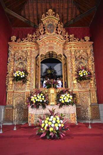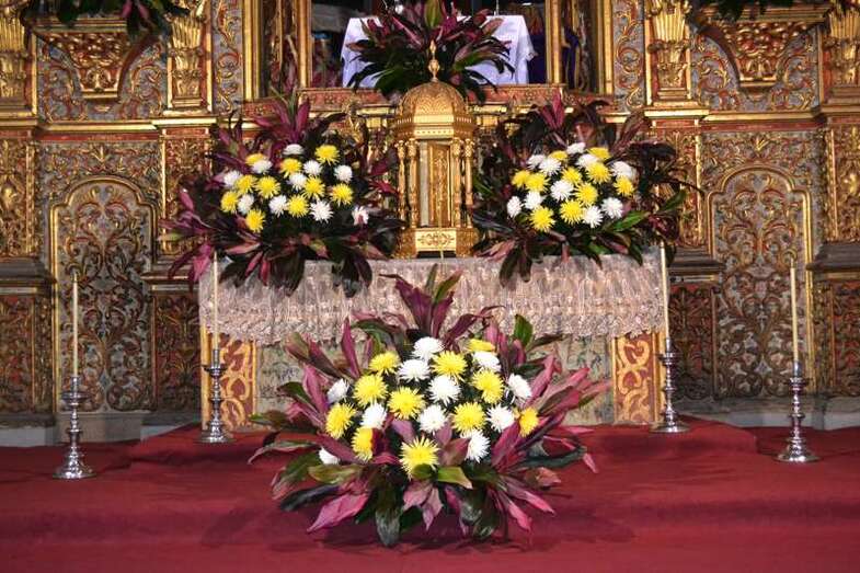 Como cada Jueves Santo, la Basílica Menor de San Juan luce un elegante monumento floral dedicado al Santísimo. Elaborada por el decorador Cristo Naranjo y por su equipo de ayudantes, la ornamentación está conformada por más de un centenar de varas de Anastacias y hojas de Cordyline. A sus pies varios candeleros y en la parte superior una mesa con cálices y capas, pan, vino, uvas y agua representan la Última Cena del Señor. TA ofrece imágenes del monumento floral.
