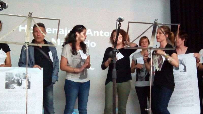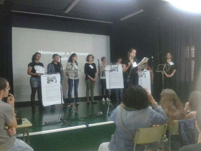 Integrantes de la plantilla de la empresa municipal Gestel, que este miércoles realiza su tercer día de huelga indefinida en reclamo de no tener más retrasos en sus salarios, explicaron sus reivindicaciones a los alumnos del IES José Frugoni Pérez, en La Rocha. Los trabajadores aprovecharon también para la lectura de un manifiesto dentro de un homenaje a Antonio Machado por el Día del Libro y anunciaron que la huelga ha quedado desconvocada.