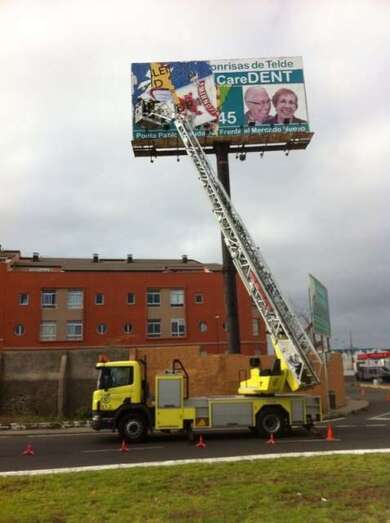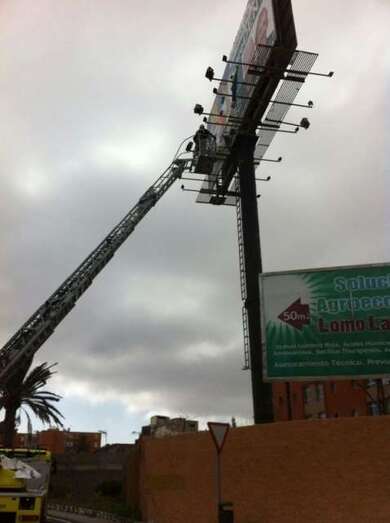 Los bomberos del Consorcio de Gran Canaria, con base en la Garita, tuvieron que intervenir este domingo por la tarde ante el peligro que ocasionaba un cartel. Realizaron, sobre las 18.00 horas, un servicio de saneamiento de un panel informativo de unos 15 metros de altura debido al desprendimiento del papel adhesivo publicitario. La actuación tuvo lugar junto a la gasolinera que está a la entrada del barrio de Las Remudas desde la GC-1.