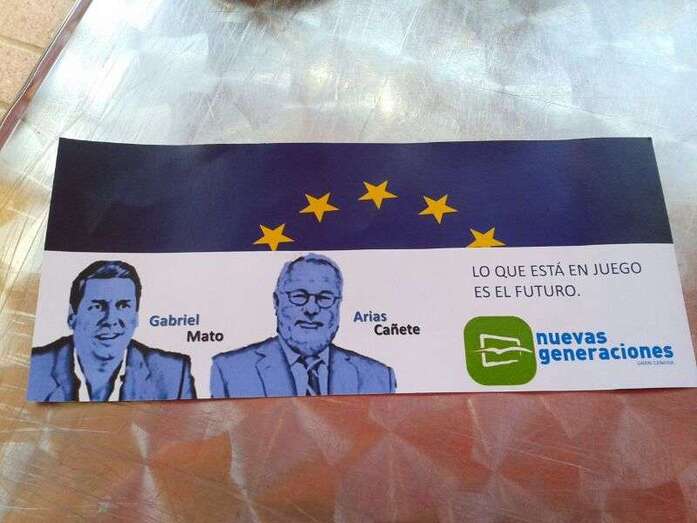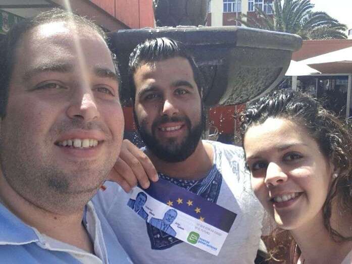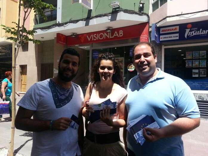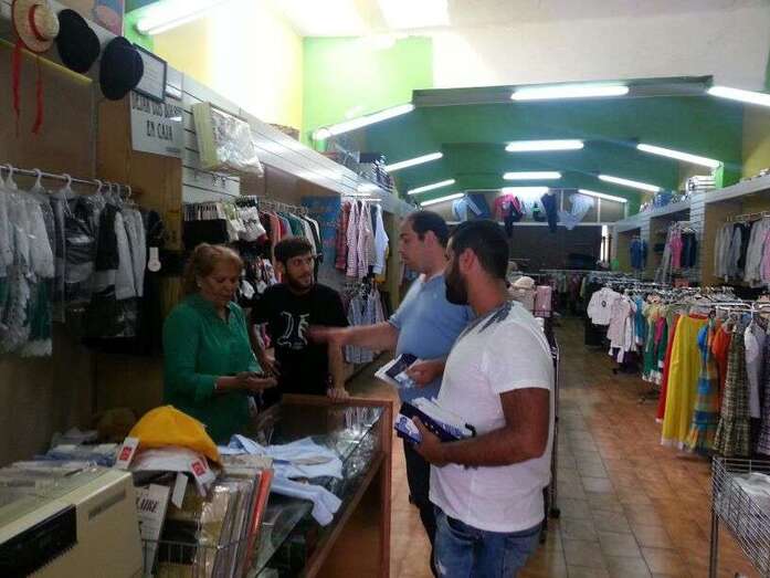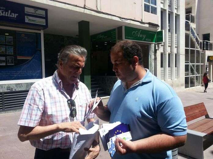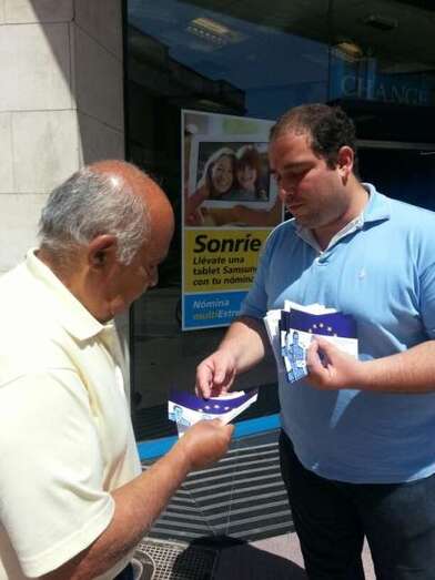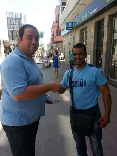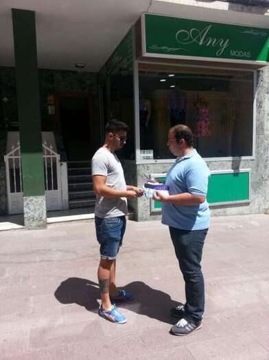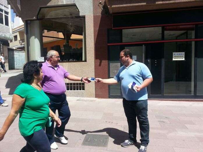 El presidente local de NNGG de Telde, Norberto Sánchez, reparte papeletas en un negocio (Foto TA)