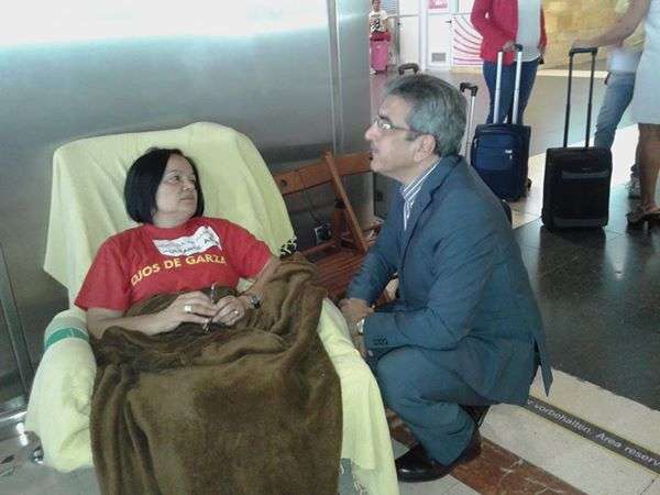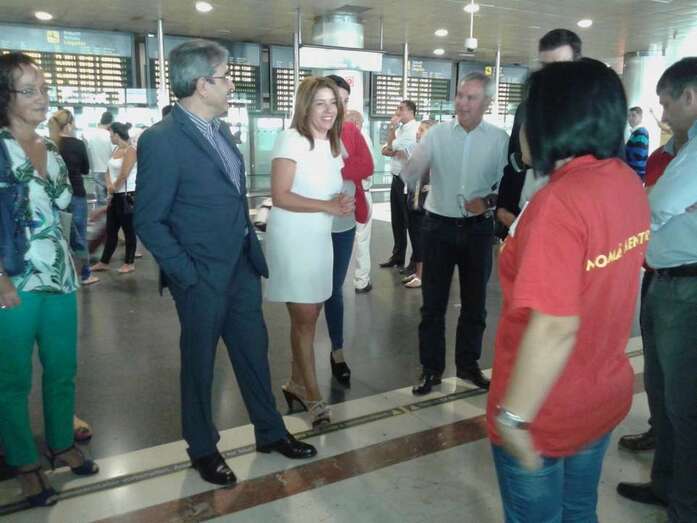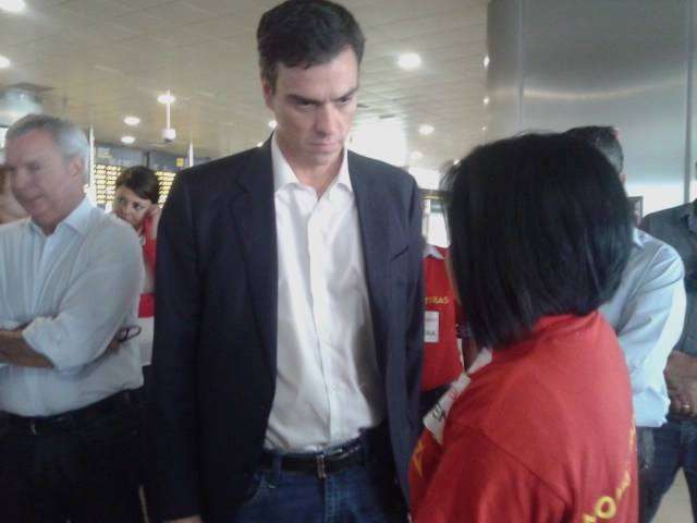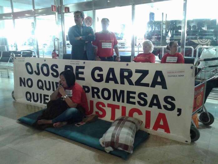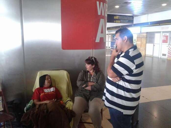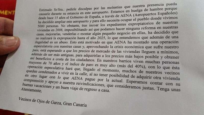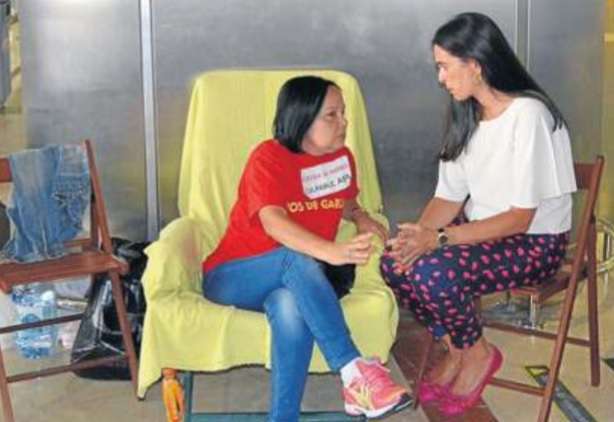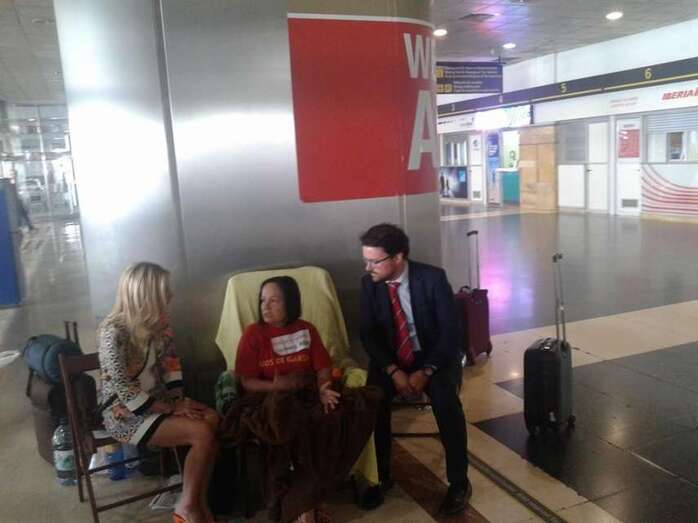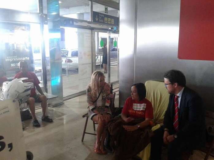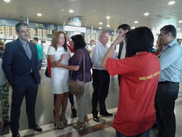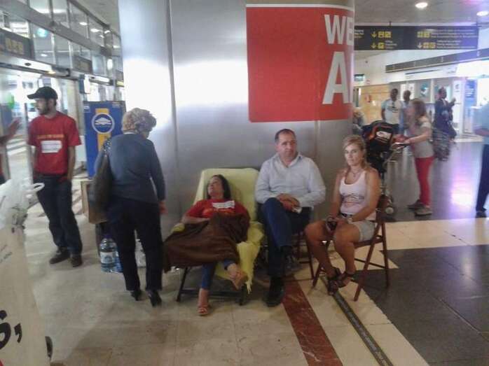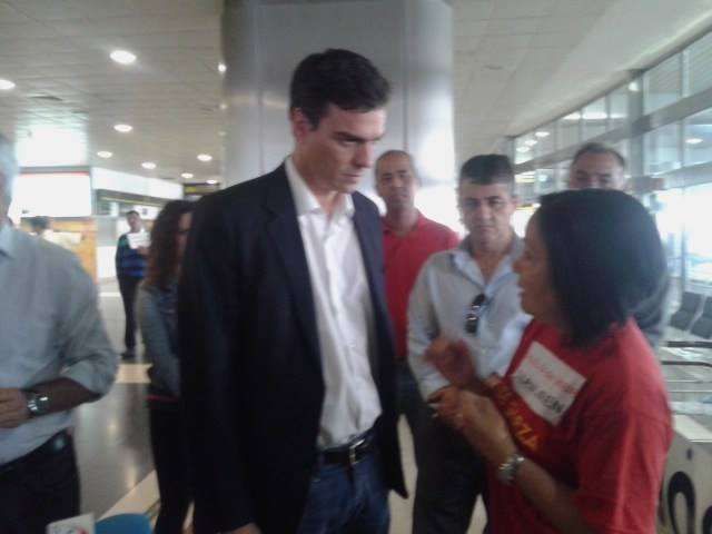 La dirigente vecinal Margarita Alonso, que mantiene desde ayer una huelga de hambre en la terminal de llegadas internacionales y nacionales del Aeropuerto de Gran Canaria para exigir a Aena la firma del convenio de realojo de los afectados por la ampliación de este aeródromo, no ha parado durante la jornada de este martes de recibir la visita de dirigentes políticos como el candidato a secretario general del PSOE, Pedro Sánchez; los diputados regionales de NC, Román Rodríguez y Carmen Hernández, y los concejales Juan Martel (CCN) y Celeste López (NC). También compartieron un rato con ella el diputado nacional Asier Antona y la parlamentaria regional María Australia, ambos del PP, así como la delegada del Gobierno en Canarias, María del Carmen Hernández Bento. TA ofrece reportaje gráfico.