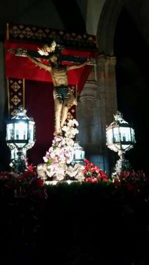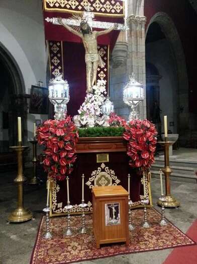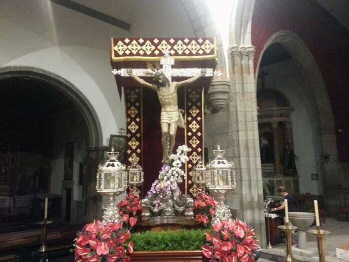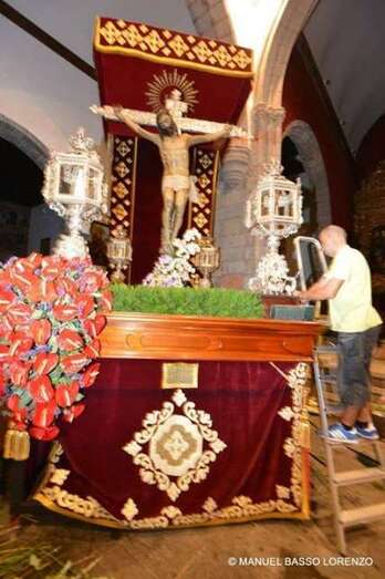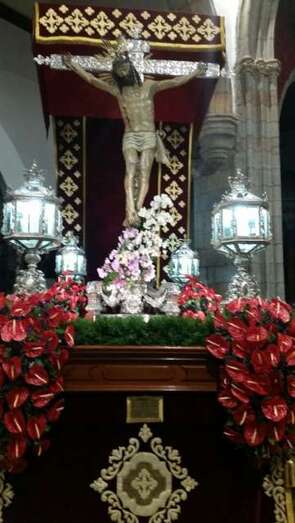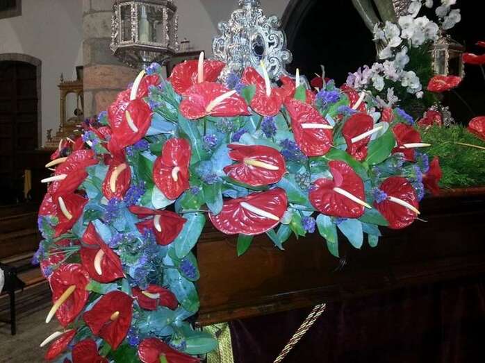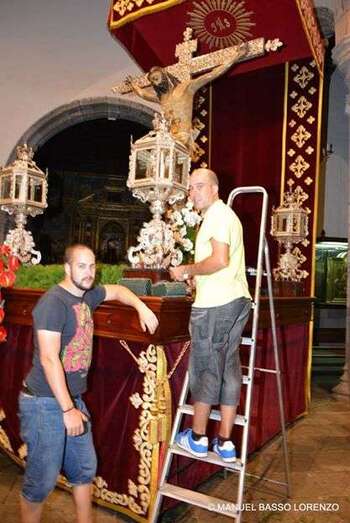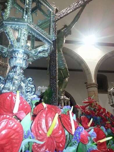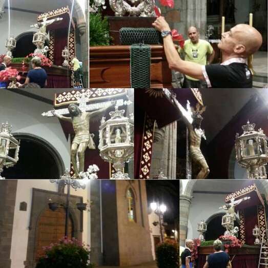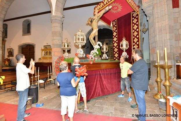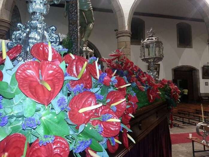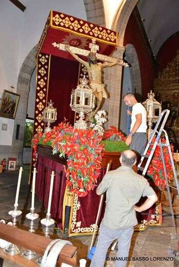 La Parroquia de San Juan ha engalanado ya con vistosos anturios rojos el trono de la esbelta escultura del Cristo de Telde de cara a la solemne procesión que recorrerá esta tarde-noche las calles del casco histórico de la ciudad al término de la misa de las 19.00 horas que presidirá en la Basílica el obispo de Canarias, Francisco Cases. Cinco solistas cantarán malagueñas a la imagen en diferentes puntos del recorrido. Un amplio equipo de colaboradores dirigidos por Segundo Amador preparó durante varias horas el trono para que luzca en todo su esplendor. TA avanza imágenes de los trabajos.