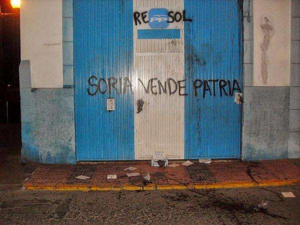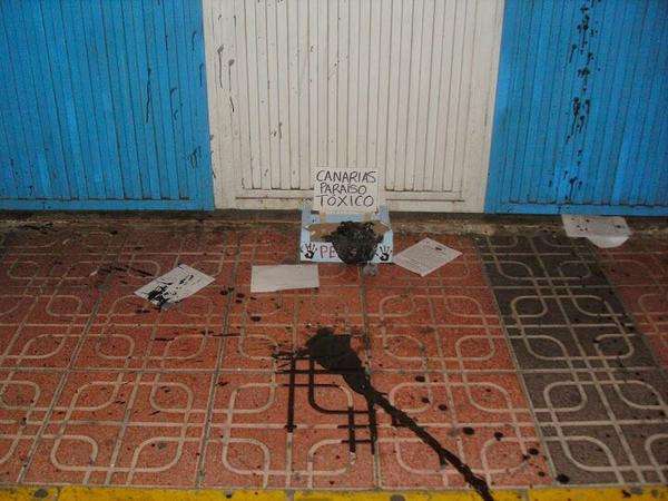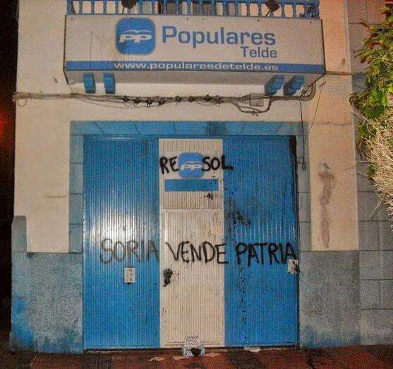 La fachada de la sede del Partido Popular en Telde, en el barrio de San Gregorio, apareció este lunes con múltiples pintadas en contra de las prospecciones petrolíferas en aguas canarias por parte de Repsol. Han dejado escritos slogans como Soria vende patria, además de una simulación de piche en el suelo en una caja que dice Canarias paraíso tóxico. Miembros de la formación política han condenado estas actuaciones en las redes sociales. Alegan que es fruto de la manipulación, de la mentira y de la desinformación. Durante la jornada de hoy el partido ha procedido a borrar las pintadas. TA ofrece imágenes de las pintadas.