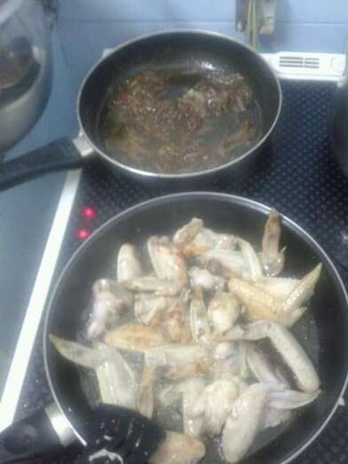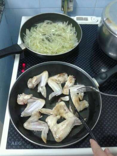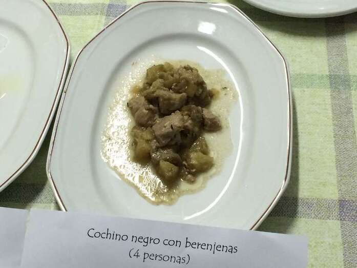 Alitas de pollo con cebolla y cochino negro con berenjenas