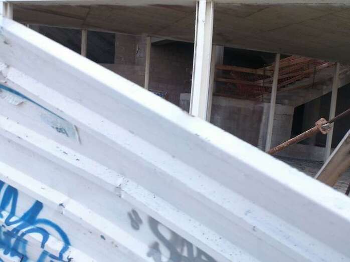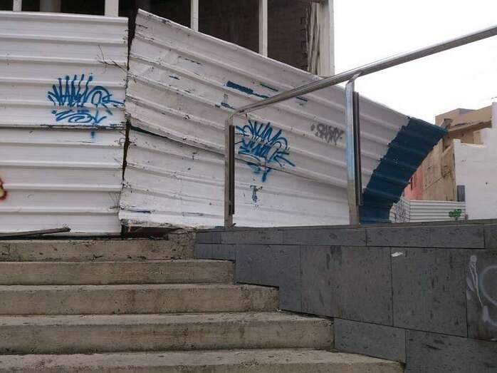 Las planchas metálicas que protegen la inacabada obra del Palacio de la Cultura, junto al parquin de Arnao, se han convertido este jueves en un peligro. El viento las ha dejado sueltas con el consiguiente riesgo de que salgan volando o que hieran a alguna persona, según denuncian vecinos de la zona.