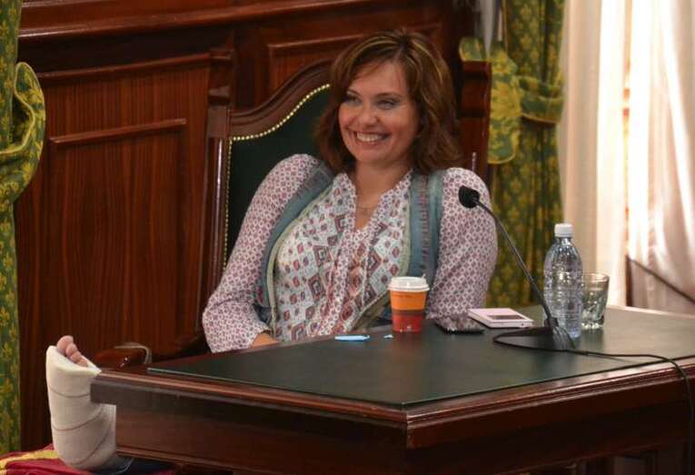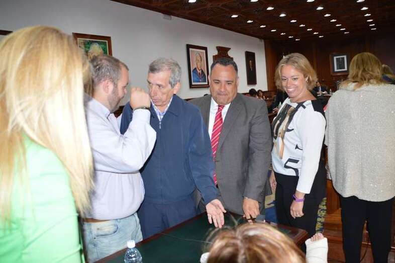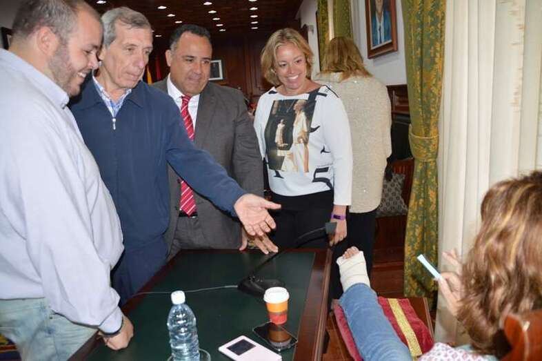 La concejala de Personal, Herminia Demetrio, acudió este martes a la última sesión plenaria del Ayuntamiento de Telde con un pie escayolado tras una caída que le produjo el pasado viernes una fractura. La popular Demetrio no pudo sentarse en su habitual escaño y para que estuviera cómoda, con la pierna estirada, se le habilitó la mesa que es usada habitualmente por los cargos no electos del Gobierno cuando se les requiere para que intervengan en los Plenos.