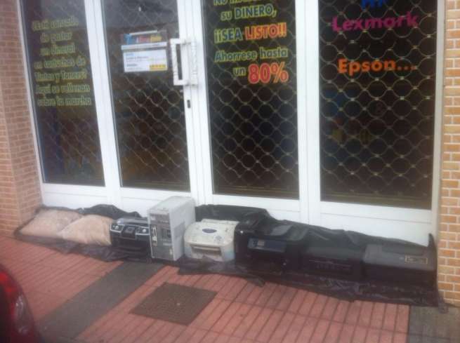Además de graves y cuantiosos daños, el temporal de lluvia que vapuleó especialmente al municipio el pasado jueves y viernes también dejó imágenes curiosas e insólitas. Como la barrera que Manuel Santana Martín, dueño de un negocio del Callejón del Castillo, dispuso formada por impresoras y ordenadores para frenar el agua que entraba en su local. Los sacos de arena no alcanzaron para cubrir el ancho de la puerta y no le quedó más remedio que recurrir a estos dispositivos electrónicos.