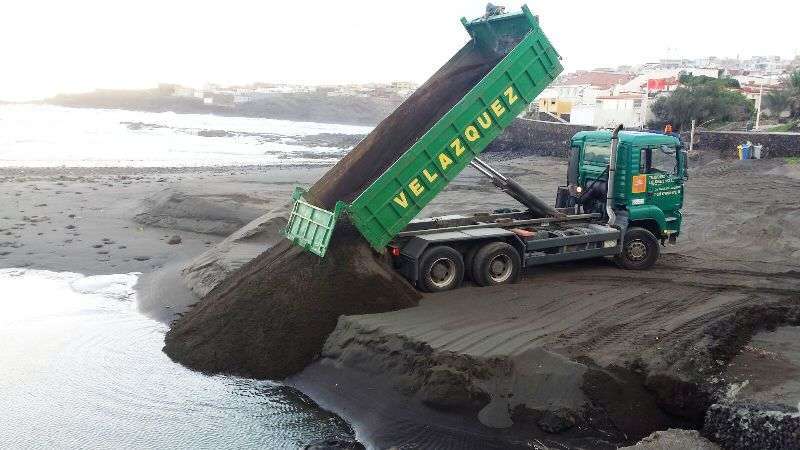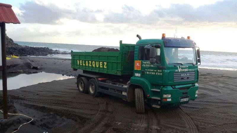 Un camión descarga arena en Hoya del Pozo procedente de Playa del Hombre (Foto TA)