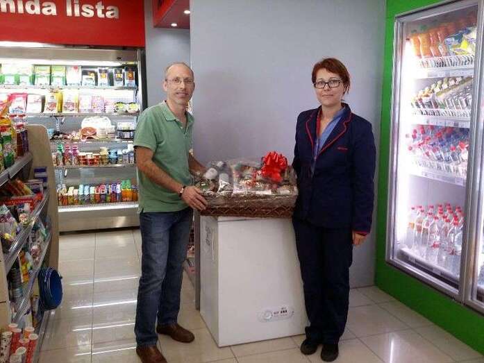 El esposo de la agraciada recibe la cesta de Navidad (Foto TA)