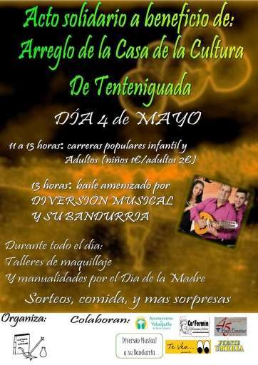 Valsequillo.- El pago valsequillero de Tenteniguada celebrará este domingo el Día de la Madre con un acto benéfico en el que se recaudarán fondos para rehabilitar la Casa de la Cultura. Para ello, la asociación cultural del barrio ha organizado toda una serie de actividades que comenzarán desde las 11.00 horas.