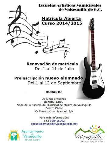 Telde.- Hasta el próximo 11 de julio está abierto el plazo de renovación de matrícula para alumnos que quieran seguir con su formación en las escuelas artísticas municipales de Valsequillo, que actualmente la conforman los diferentes departamentos de música, danza, pintura y folklore.