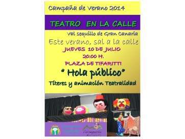 Valsequillo.- El mundo del teatro volverá este jueves a tomar las calles de Valsequillo de la mano de la compañía Teatralidad que presentará su espectáculo Hola Público. Una pieza de títeres e interpretación que tendrá lugar a partir de las 20.00 horas en la Plaza de Tifariti.