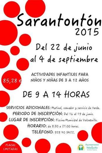 El Sarantontón 2015 llega con una amplia oferta educativa y de ocio, en donde la población infantil de Valsequillo, con edades comprendidas entre los 3 y los 12 años de edad, disfrutará de un verano diferente y lleno de diversión.