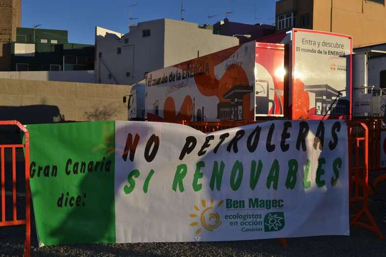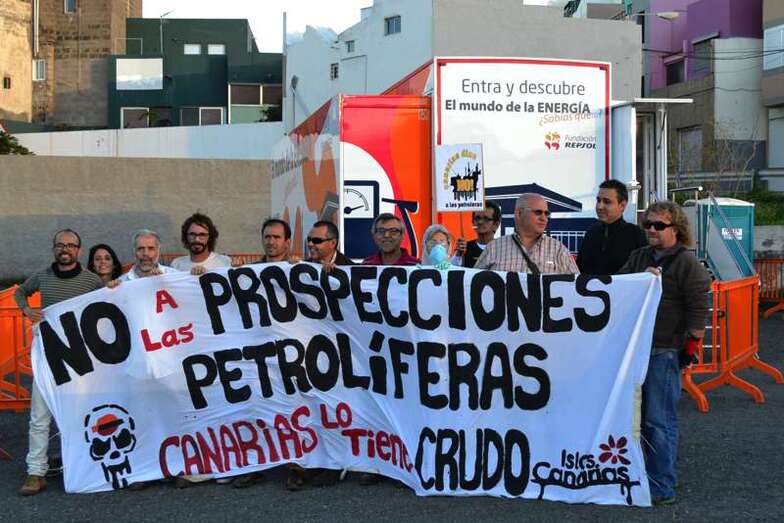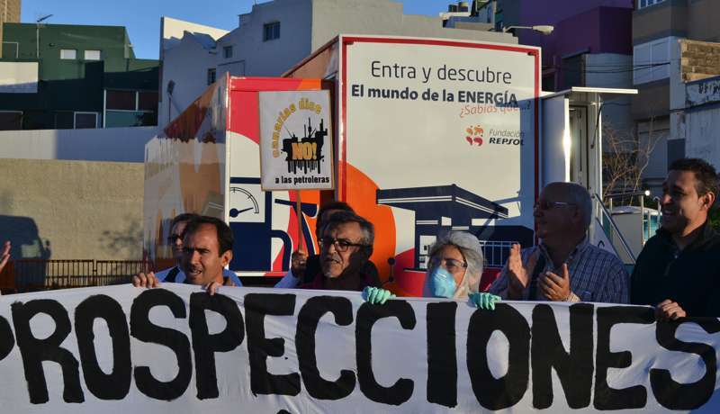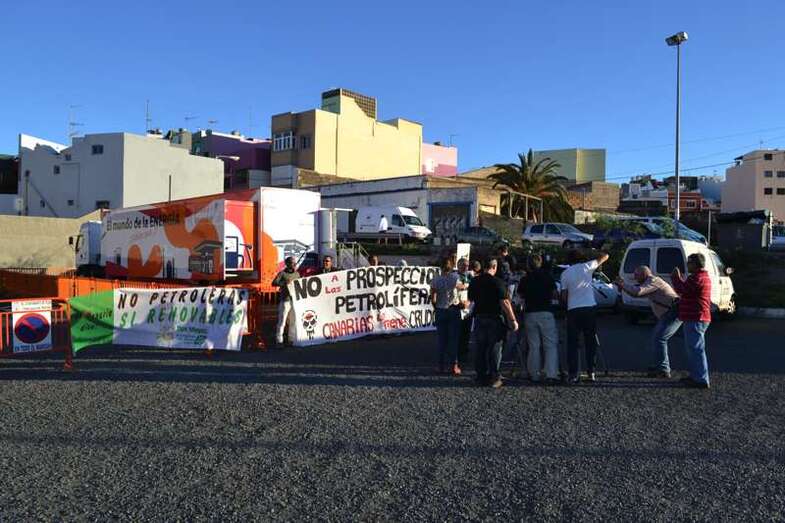 Telde.- Varios activistas y colectivos ecologistas se han concentrado esta tarde en Telde para protestar contra las prospecciones petrolíferas en aguas de Canarias y del Norte de la África y también para denunciar lo que consideran una “manipulación” y “lavado de cerebro” por parte de Repsol a los cientos de escolares teldenses que estos días visitan el aula móvil que la compañía de hidrocarburos ha instalado en el municipio.