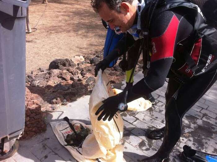 Telde.- Unos 20 kilos de residuos fue la cantidad que se extrajo este sábado de los fondos marinos de la playa de Melenara en la limpieza llevada a cabo por buceadores de los clubes Gran Azul, Henrisub y Timot, con la colaboración de la Concejalía de Playas. TA ofrece reportaje gráfico.