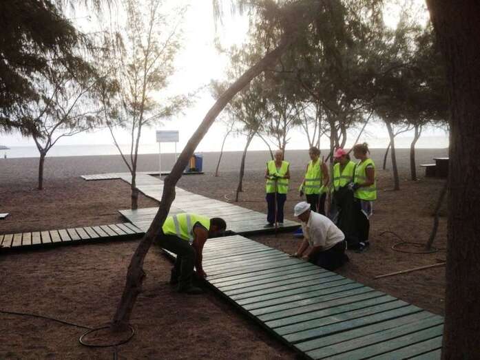 Personal de la delegación de María González Calderín adecenta el equipamiento y los bancos del paseo marítimo