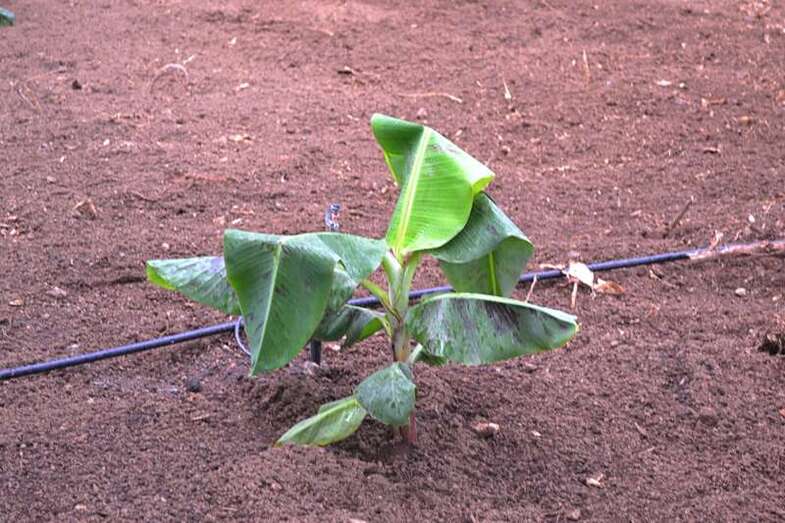 El propio Torres visitaba días atrás el huerto para comprobar que todo marchaba según lo previsto y que el sistema de riego por microaspersión ya surtía de agua a estas plantas que en aproximadamente un año y medio, cuando alcancen una altura cercana a los 2,8 metros, estarán dando racimos de plátanos cuyos frutos serán un poco más pequeños que los de antes pero igual de sabrosos.
