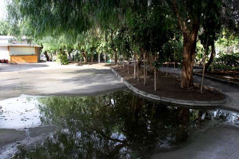 Pude disfrutar de un parque mucho más limpio que en otras ocasiones, dejándose ver a los empleados del servicio de parques y jardines en plena labor en varios puntos. Con amenazas de precipitaciones por la inclemencia del tiempo y completamente cubierto el cielo de nubes que anunciaban agua, se podía gozar del aire fresco, de un aire, por lo menos es mi apreciación libre de contaminación, y de la tierra empapada que bajo el césped, al pie de los grandes árboles y entre los arbustos dejaba ver una tierra húmeda, encharcada por los senderos a los lados de las veredas cubiertas de hierba, charcos sobre los que se reflejaban los perfiles de sombras, ramajes, copas de árboles y palmerales. La antigua zona del platanar que conserva su acequia, ha sido restaurada con un cultivo de plataneras nuevas, huerto urbano que continúa rodeada de estrelitzias.
