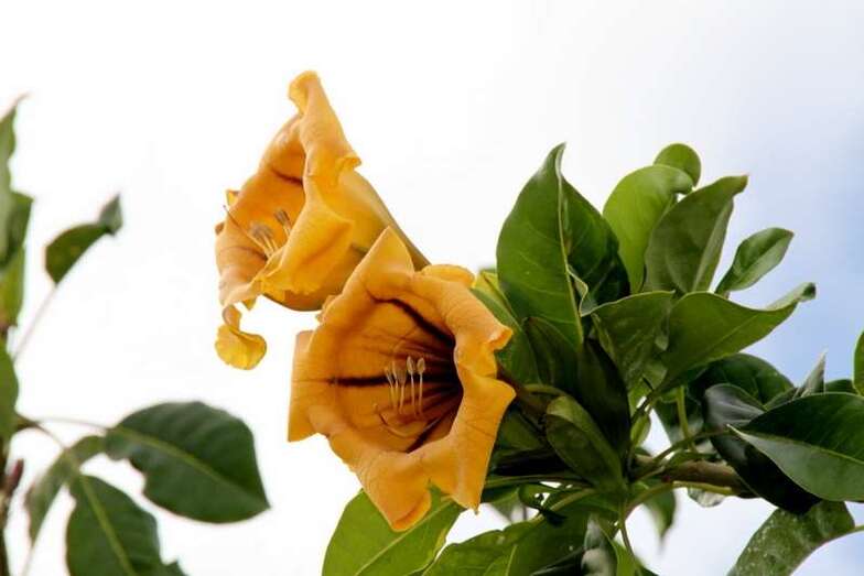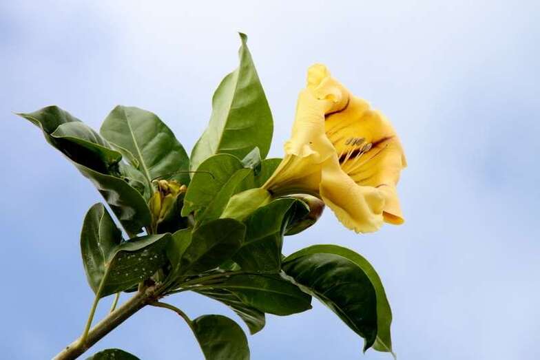 Flores allamandas de intenso color amarillo, strelitzias, rosas, hibiscos, piscualas de floración roja que penden en racimo, Solandras, flores en forma de embudo o trompeta conocida también como copa de oro, la misma que en La noche de la Iguana, novela del dramaturgo norteamericano Tennessee Williams, llevada al cine en 1964 por John Huston, en una de las primeras escenas aparece esta flor copa de oro, que ofrece la joven Charlotte (Sue Lyon) al ex clérigo Shannon (Richard Burton), iniciando un seductor diálogo entre ambos. Película en la que se recita un bello poema, acabado al final de la vida del poeta, un “joven” abuelo de 97 años: el mar es la cuna de la vida, con cercanas reminiscencias líricas, paisajísticas y reflexivas sobre el paso del tiempo.
