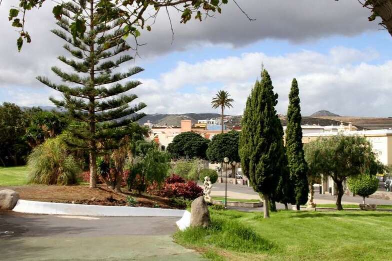 El parque seguirá recibiendo el agua sagrada del cielo, tras el umbral de la puerta principal no lejos se divisan, apuntando al cielo, las torres de la Basílica Menor de San Juan Bautista. Una suave y fina lluvia comienza a caer, lentamente me alejo, dejo atrás los verdes matices de este jardín tropical, inhalando el aire limpio con aromas de césped cortado, dejo el pulmón verde de este cuerpo urbano en la histórica, sede aborigen de uno de los dos guanartematos de la isla de Canaria, la ciudad de los Faycanes, nuestra secular Telde.