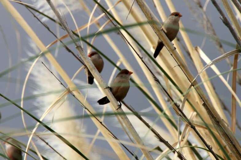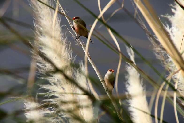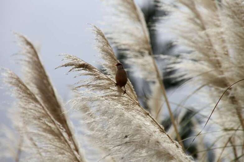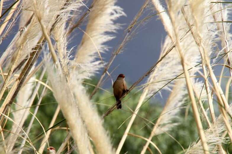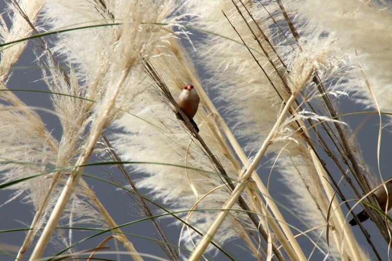 En un momento de mi inesperado recorrido observo como unos gorriones, pequeños pájaros moros, preciosos camachuelos, revolotean y se posan sobre unos penachos plateados o colas de zorro en torno al parterre central, que se elevan por encima de mi cabeza; con cautela dispongo la digital y espero el momento adecuado para tomar algunas imágenes de los mismos, un tanto difícil, mi presencia les inquieta, no paran de cambiar de posición y cambiar de penachos. Algún que otro mirlo posado sobre la hierba, asciende y desciende perdido entre el espeso ramaje de los árboles, tórtolas, grupos de palomas vuelan sobre este inmenso jardín.