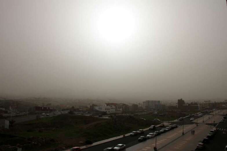 Desde este mediodía, se observa desde el casco de Telde como aumenta la entrada de calima, dejando sin visibilidad la línea de costa del litoral teldense, medianías y cumbres, y escondiendo la trayectoria solar hacia las cumbres. Hacia el suroeste del municipio también se aprecia una calima con visibilidad reducida que contrasta con el verde sobre la húmeda tierra debido a la buena agua caída días atrás.