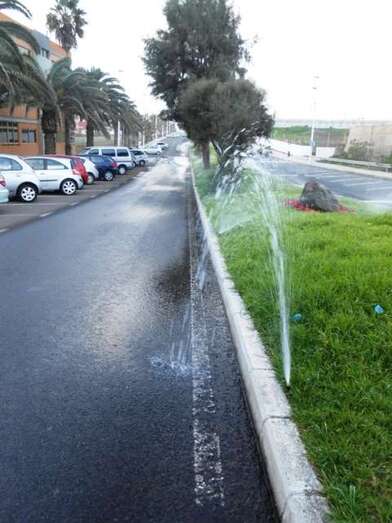 La Concejalía de Parques y Jardines debería tomar buena nota de la dilapidación de recursos públicos que se produce casi a diario en esta importante arteria del entramado viario de la costa por el mal funcionamiento de muchos aspersores de riego que dirigen el agua hacia la vía y no hacia las zonas verdes.