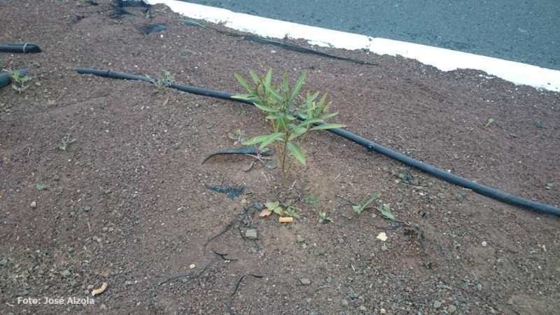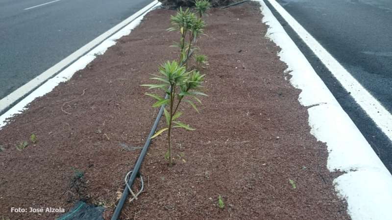 En el mismo mes de septiembre de 2014, con una diferencia de 15 días, operarios del Cabildo, plantó la misma especie, ‘Adelfas’ en los parterres de la avenida que gestiona el Cabildo, cuyo tratamiento de tierra es adecuado, como se puede observar la diferencia en el crecimiento de la misma planta es bastante concluyente.