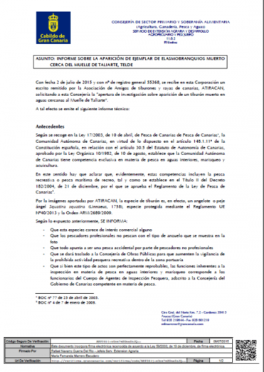 A pesar de todo, el Cabildo de Gran Canaria ha emitido un informe técnico en el que afirma, que según las imágenes aportadas por Atiracan, el ejemplar encontrado es un tiburón ángel o angelote (Squatina squatina), especie que se encuentra en peligro crítico de extinción.
