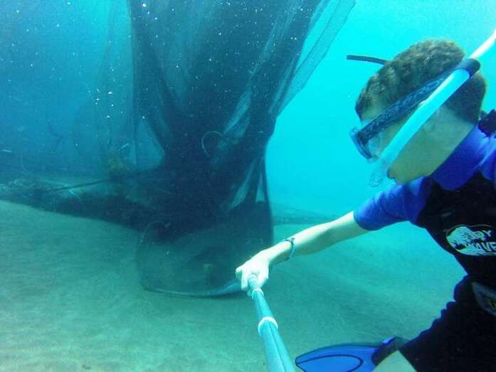 Buceadores, nadadores y usuarios de la cala de Salinetas comprobaron el pasado fin de semana como una jaula flotantes (redes de sardinillas) se transformaba en una trampa mortal para infinidad de mantas y diferentes especies que se enredaban en las mallas allí ancladas.