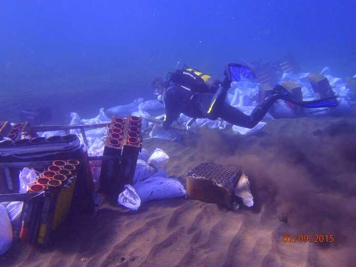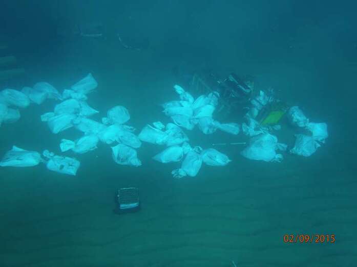 Telde.- Un equipo de buceadores del club Letisub se encargó de retirar ayer los elementos que cayeron al mar del espectáculo pirotécnico celebrado la noche del pasado sábado en la playa de Melenara. Carcasas de voladores, sacos de arena, soportes y otros materiales que se habían sumergido fueron extraídos a varios metros de profundidad de la cala teldense.