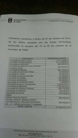 Telde.- La primera estimación oficial realizada por el Ayuntamiento de Telde hoy fija en 21,4 millones el importe de los daños causados por el temporal de la pasada semana, pero esta cifra puede seguir aumentando conforme llegan nuevos datos y se tiene conocimiento de nuevas incidencias, como el desplome de muros. Así lo ha advertido la alcaldesa, Carmen Hernández, en la rueda de prensa ofrecida esta mañana y donde ha avanzado que la reconstrucción del municipio arrancará, con dos obras urgentes, en La Garita y Jinámar.