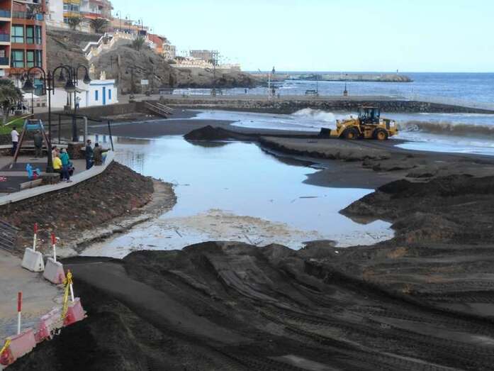 En la playa de Melenara, el tractor prestado por el Ayuntamiento de San Bartolomé de Tirajana se afanaba esta tarde en extender la arena en la playa de Melenara para tapar una enorma zanja abierta por la escorrentía del barrranco que desemboca en esta cala.